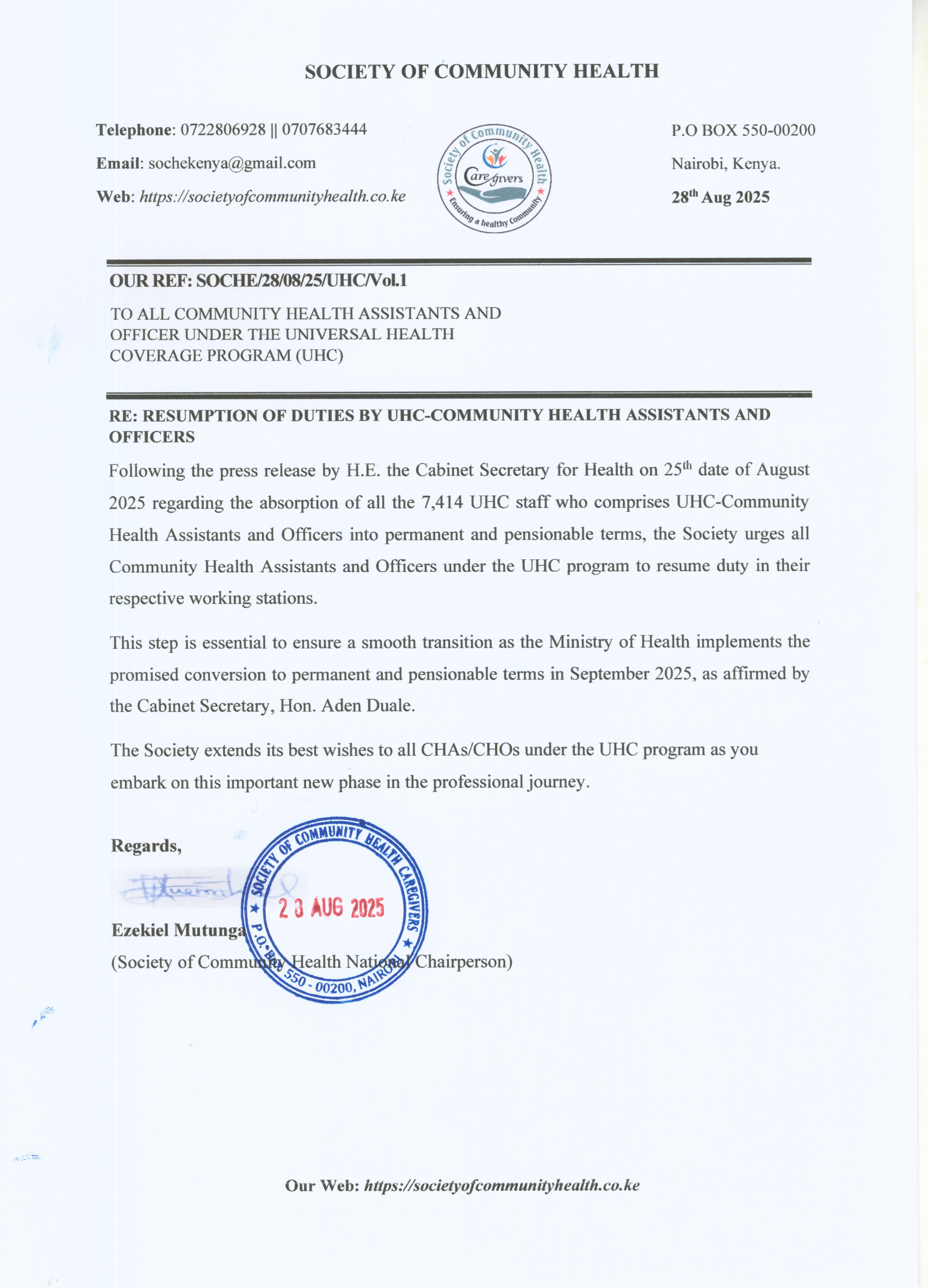 The Society of Community Health Caregivers as founded in February 2020 by graduates in Community Health from various universities and colleges across all 47 counties. Its primary mission was to amplify the voice of Community Health professionals and advocate for the broader interests of Community Health. The Society was officially registered under the provisions of CAP 108 of the Societies Act, by the Registrar of Societies in November 2020.